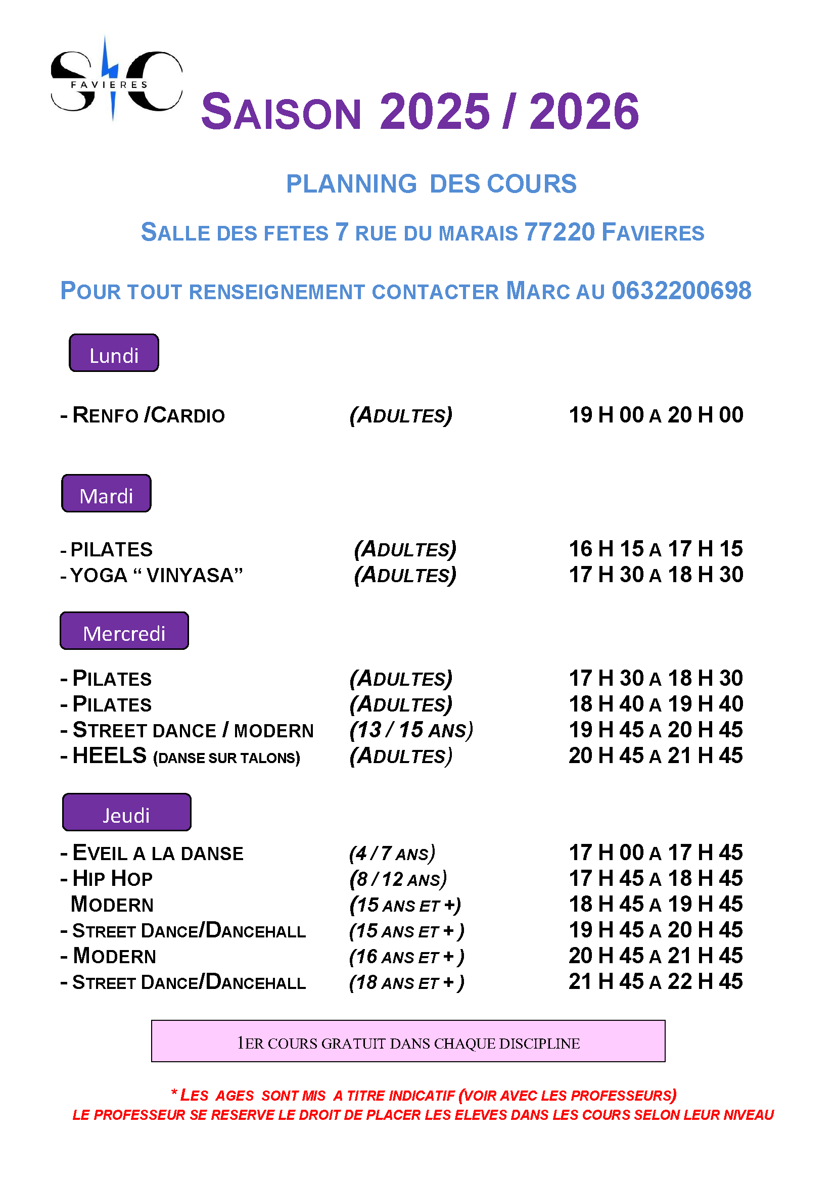 | Le Sporting Club de Favières vous accueille presque tous les jours à la salle des fêtes de Favières. Fort de ses valeurs fondées sur le respect, le partage et la convivialité son seul but est de vous faire grandir, progresser, vous divertir et vous épanouir.Le sport est un élément important qui permet à chacun d’assimiler des règles, le goût de l’effort, le respect de l’autre, le fair-play : un ensemble de qualités que nous avons à coeur de transmettre dans nos nombreux cours :– Initiation Hip-Hop, pour les bambins de 4 à 6 ans– – Hip Hop (enfants, ados et adultes) – Modern’ Hip-Hop (enfants) – Modern’dance / street (ados et adultes) – Gym douce (adultes) – Gym / stretching (adultes) – Pilates (développement des muscles profonds, amélioration de posture, équilibrage musculaire et assouplissement articulaire). – YOGA, le mardi à 18h30 Le Hatha Yoga consiste en des postures douces et des techniques de respirations. Ses bienfaits sont multiples :