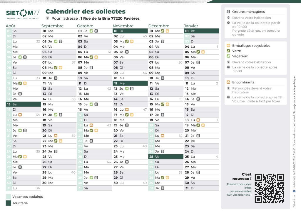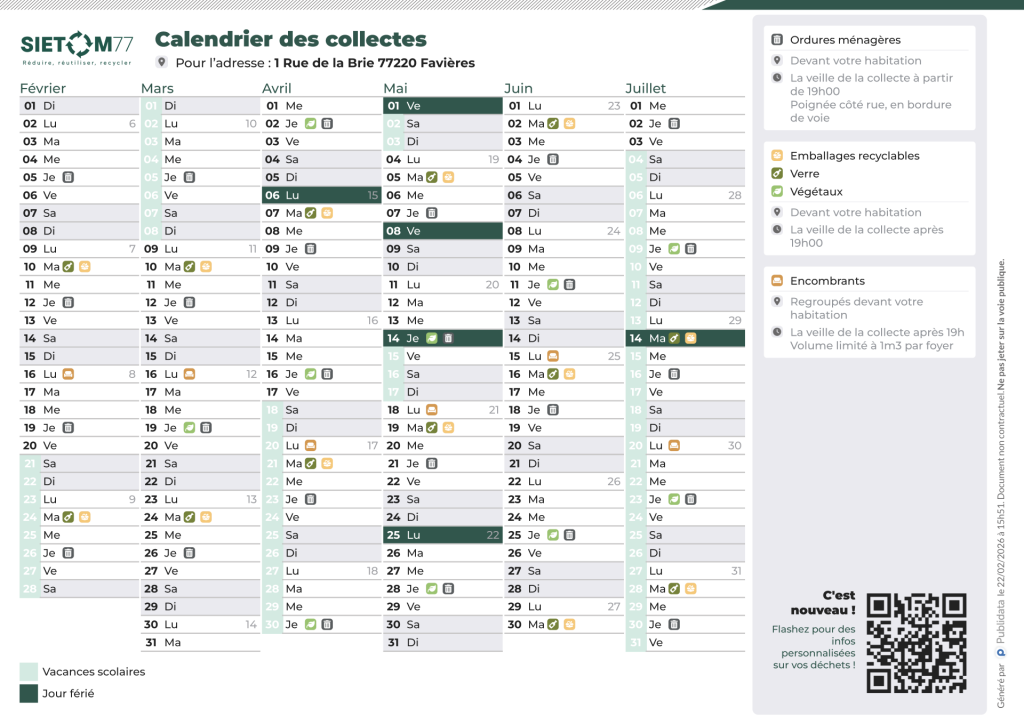 Calendrier de collecte des dechets SIETOM 77 – Fevrier a Juillet 2026 – 1 Rue de la Brie 77220 Favieres