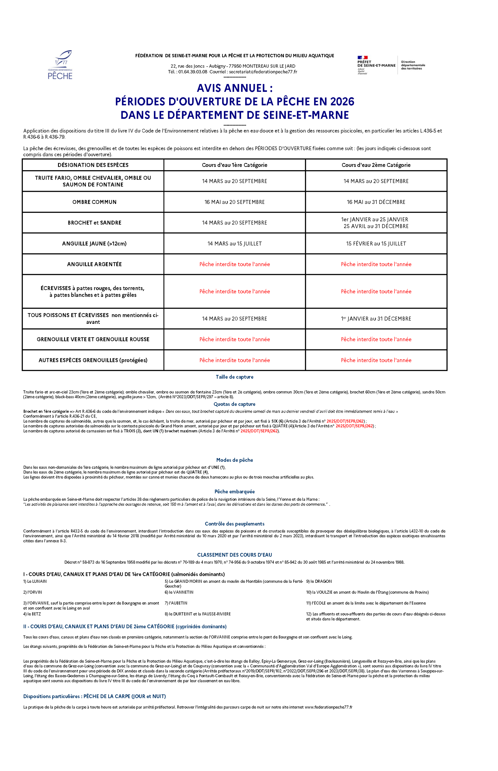 Vous trouverez en pièces jointes, les documents relatifs aux périodes de pêche pour l’année 2026.