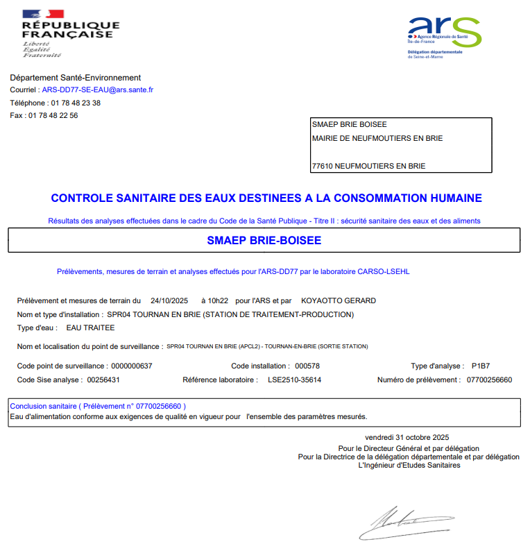 Ci-joint les résultats des analyses du CONTROLE SANITAIRE DES EAUX du 24/10/2025 transmis par le SMAEPBB.
